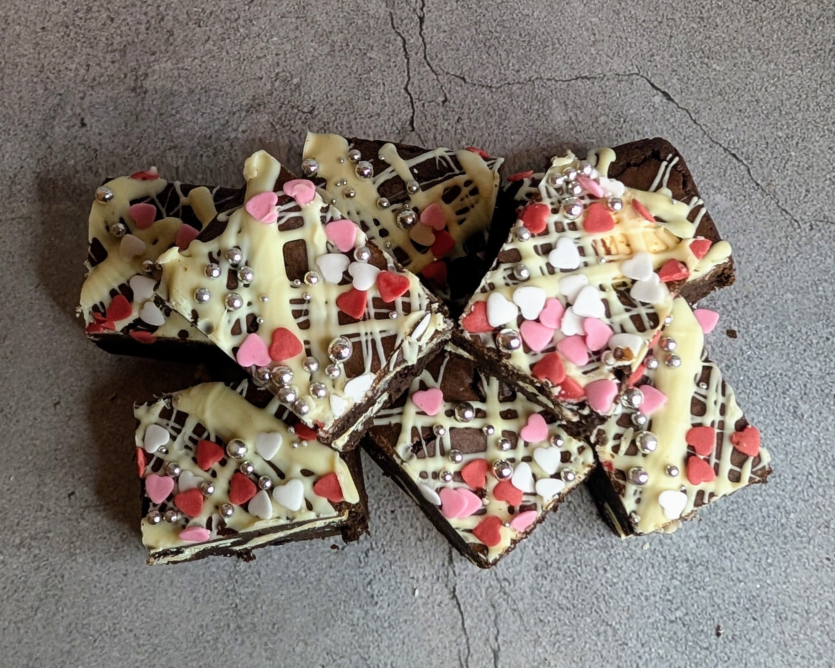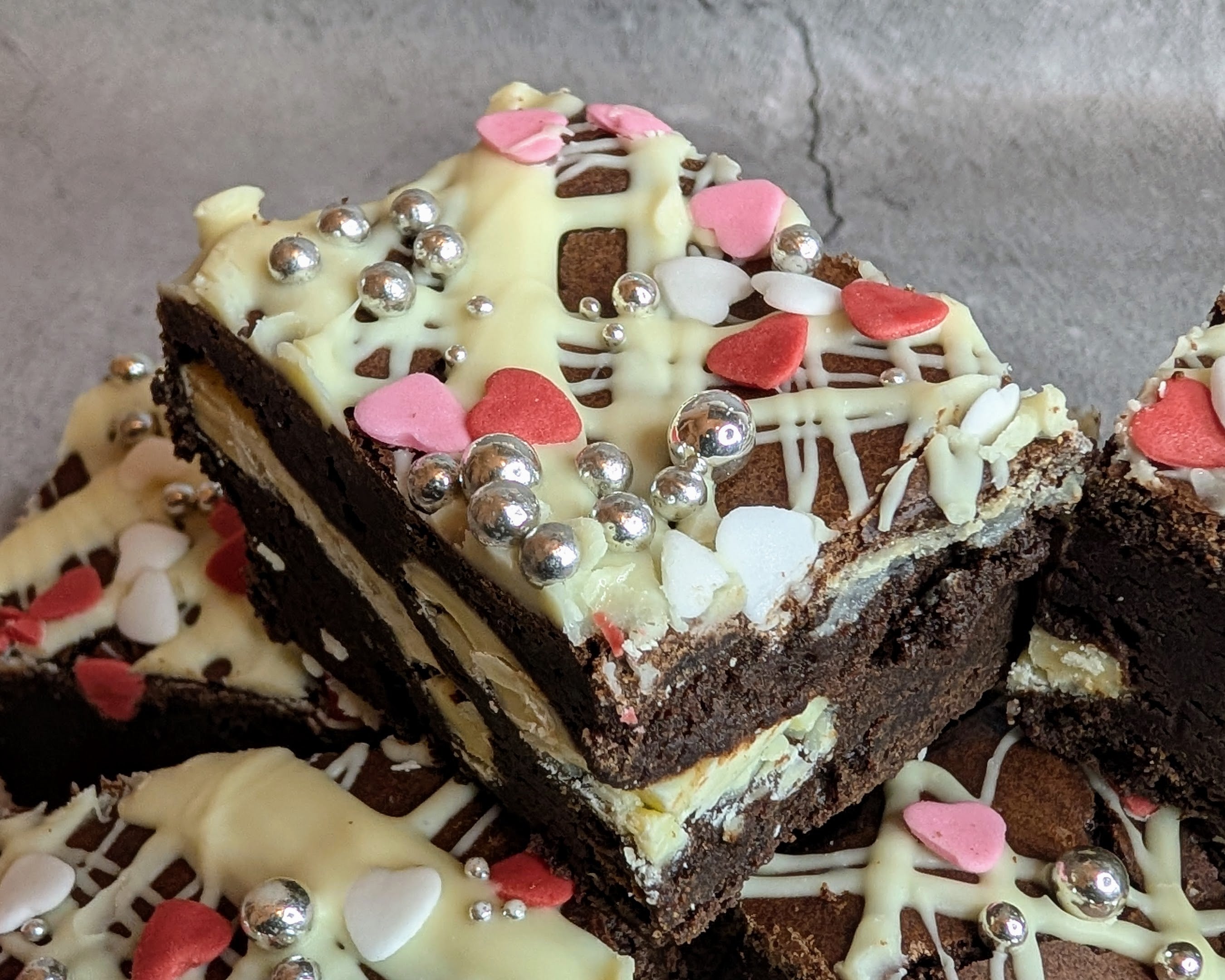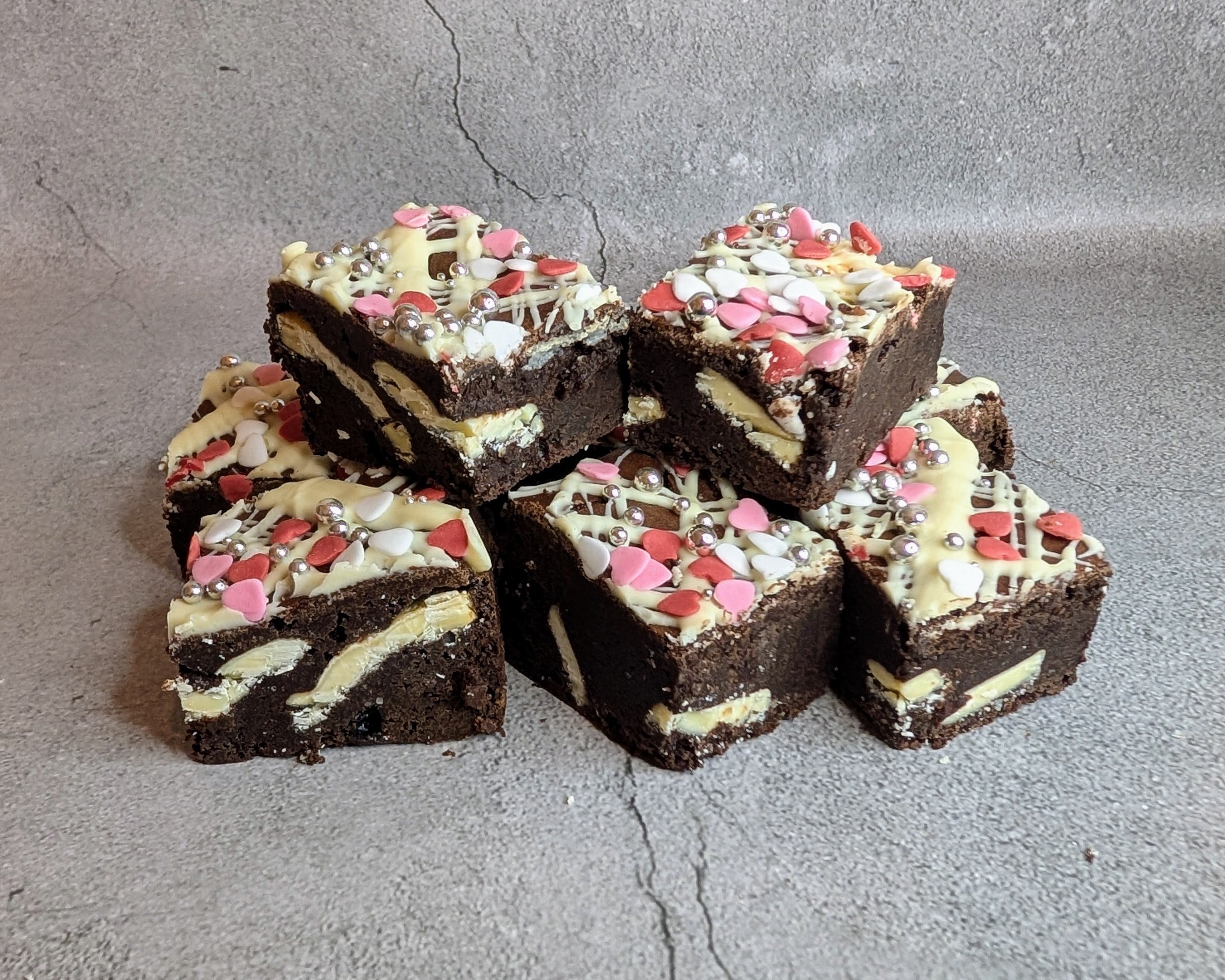 Our Valentine’s brownies are made with a rich gluten-free base and packed with white chocolate chunks throughout. Finished with a white chocolate drizzle and subtle Valentine’s detailing, they’re indulgent by design and available for a short time only.